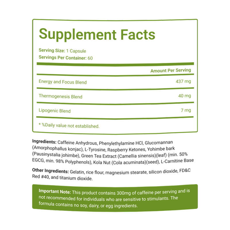 Raspberry Ketones, Yohimbe bark (Pausinystalia johimbe), Green Tea Extract (Camellia sinensis)(leaf) (min. 50% EGCG, min. 98% Polyphenols) | |
