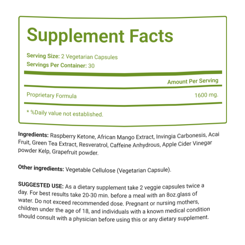 Raspberry Ketone, African Mango Extract, Invingia Carbonesis, Acai Fruit, Green Tea Extract, Resveratrol, Caffeine Anhydrous, Apple Cider Vinegar powder Kelp, Grapefruit powder. +%Daily value not established.