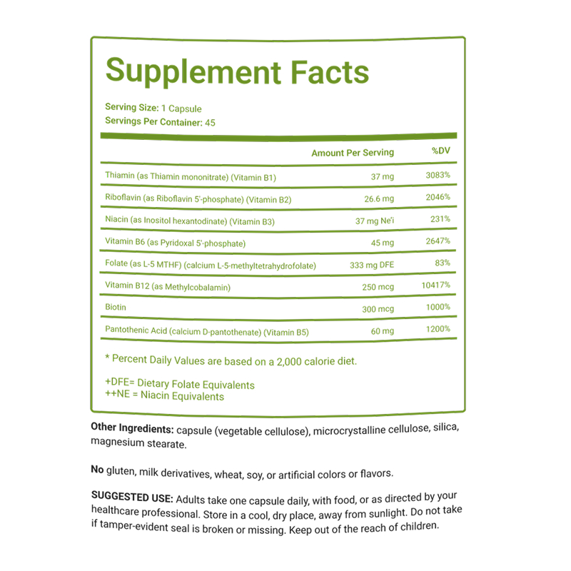 Featuring activated folate as L-5-methyltetrahydrofolate (L-5 MTHF), activated vitamin B12 as methylcobalamin, coenzymated vitamin B6 (P5’P), and coenzymated riboflavin (R5’P) for superior absorption and greater efficacy.*