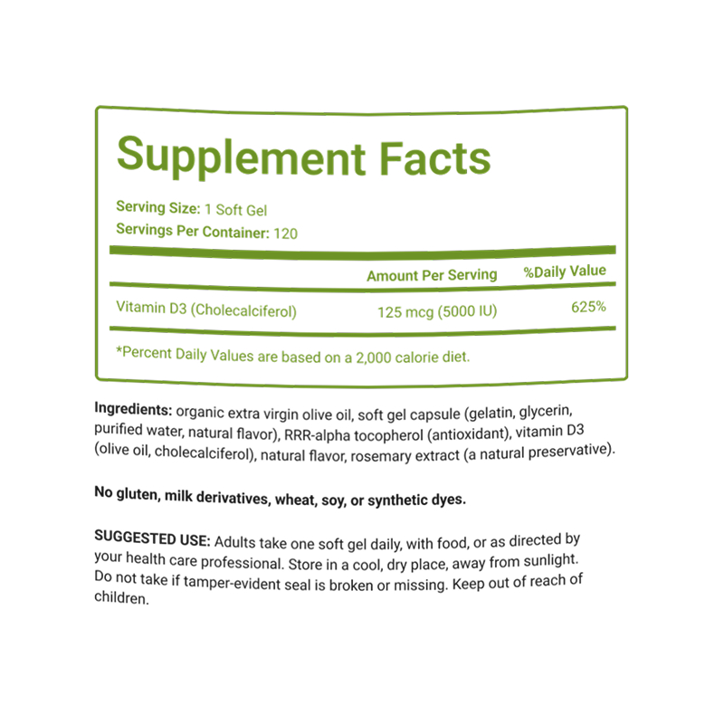 Ingredients: organic extra virgin olive oil, soft gel capsule (gelatin, glycerin, purified water, natural flavor), RRR-alpha tocopherol (antioxidant), vitamin D3 (olive oil, cholecalciferol), natural flavor, rosemary extract (a natural preservative).